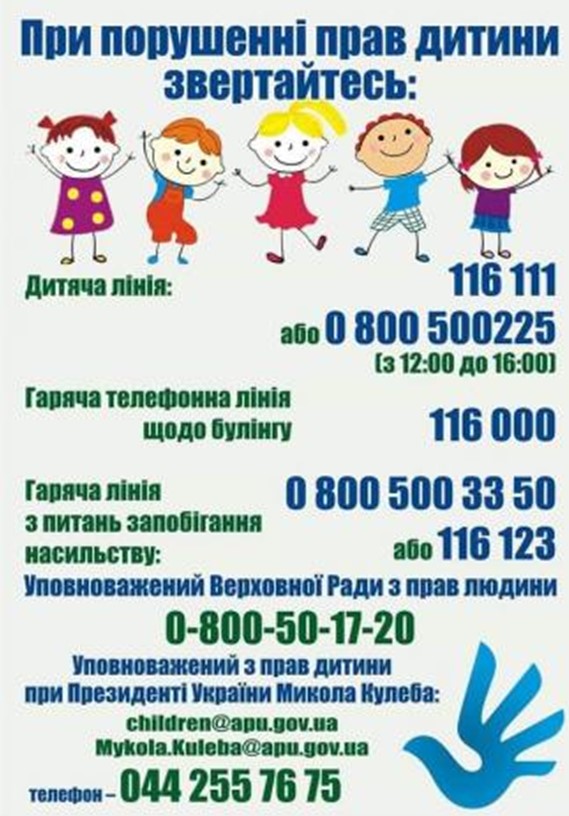 Національної дитячої «гарячої лінії» 0 800 500 225 або 116 111 (для дзвінків з мобільного).