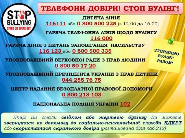 Національна дитяча «гаряча лінія»: 8 800 500 225 (зі стаціонарних телефонів) та або 116 111 (з мобільних телефонів).